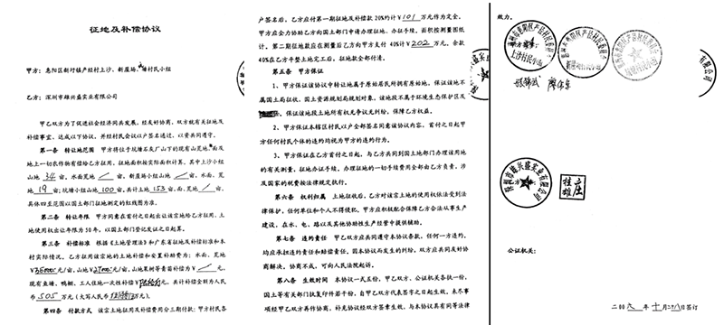 此时张育强开出的条件与双方最初口头达成的条件相差很大,雄兴盛公司迫于无奈的同意了他提出的条件。双方于2006年10月28日签订了《土地及补偿协议》(见附件4)。该《协议》约定土地补偿和安置补助费共计人民币505万元。并规定了相应的付款方式和双方的权利义务等条款。
